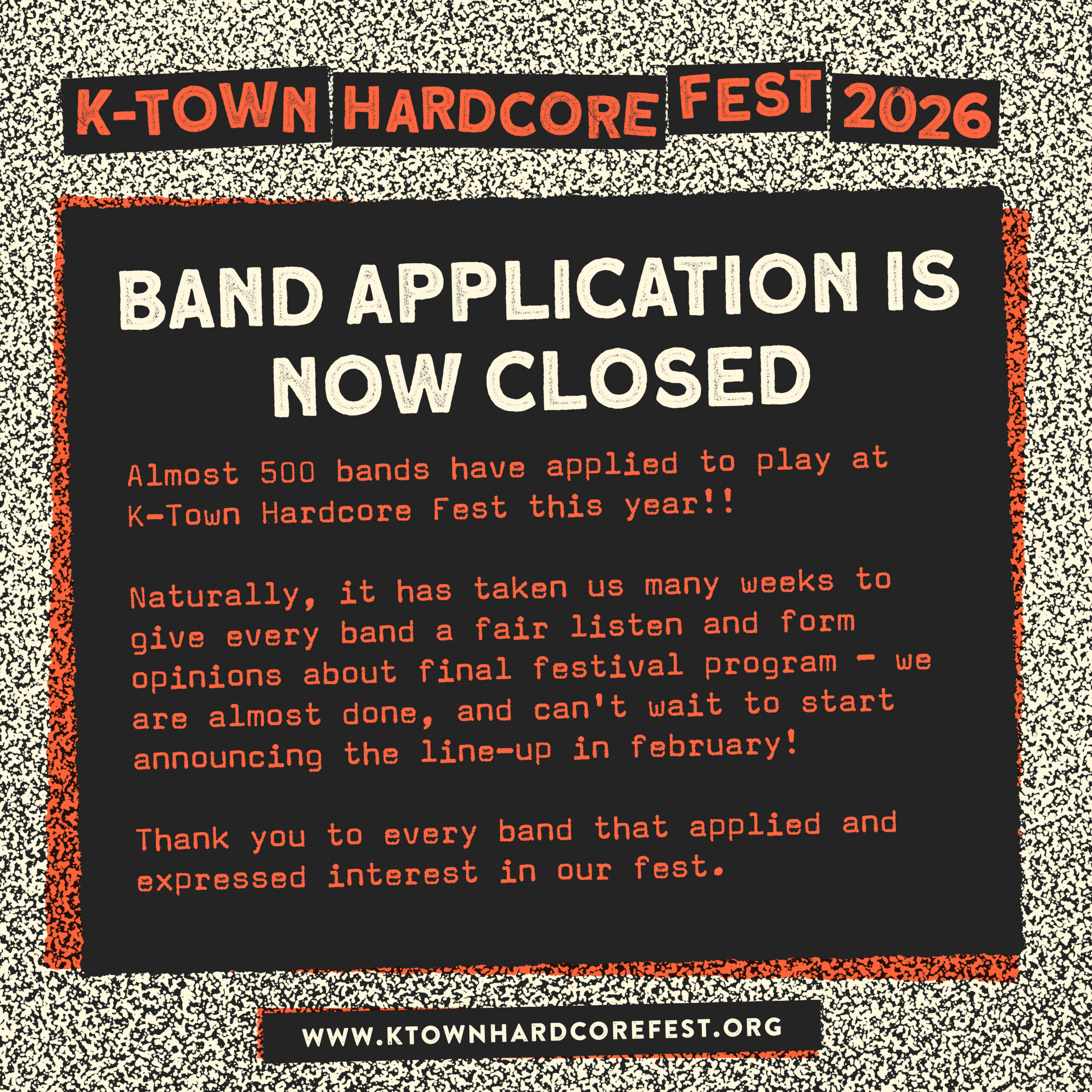Band application for K-Town Hardcore Fest 2026 is now closed
