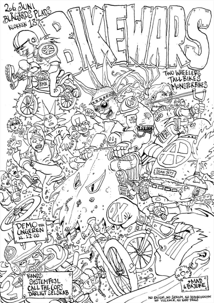 As we done the previous years, Bike Wars happens on Blågards Plads right in the middle of Nørrebro at 13.00. But you can join us at Ungdomshuset at 12.00, where we’ll walk in unison towards the Bike Wars arena. During Bike Wars/Punx Picnic food and beer will be available for purchase.